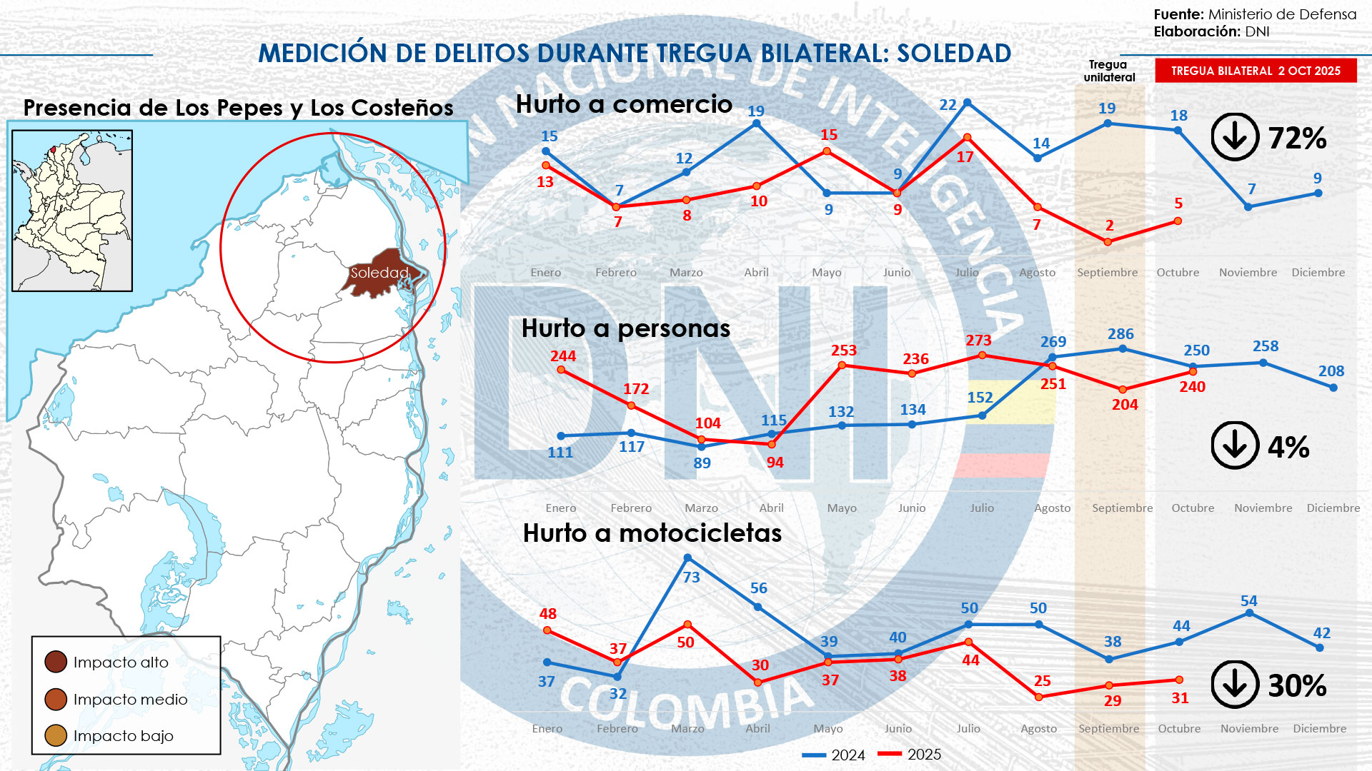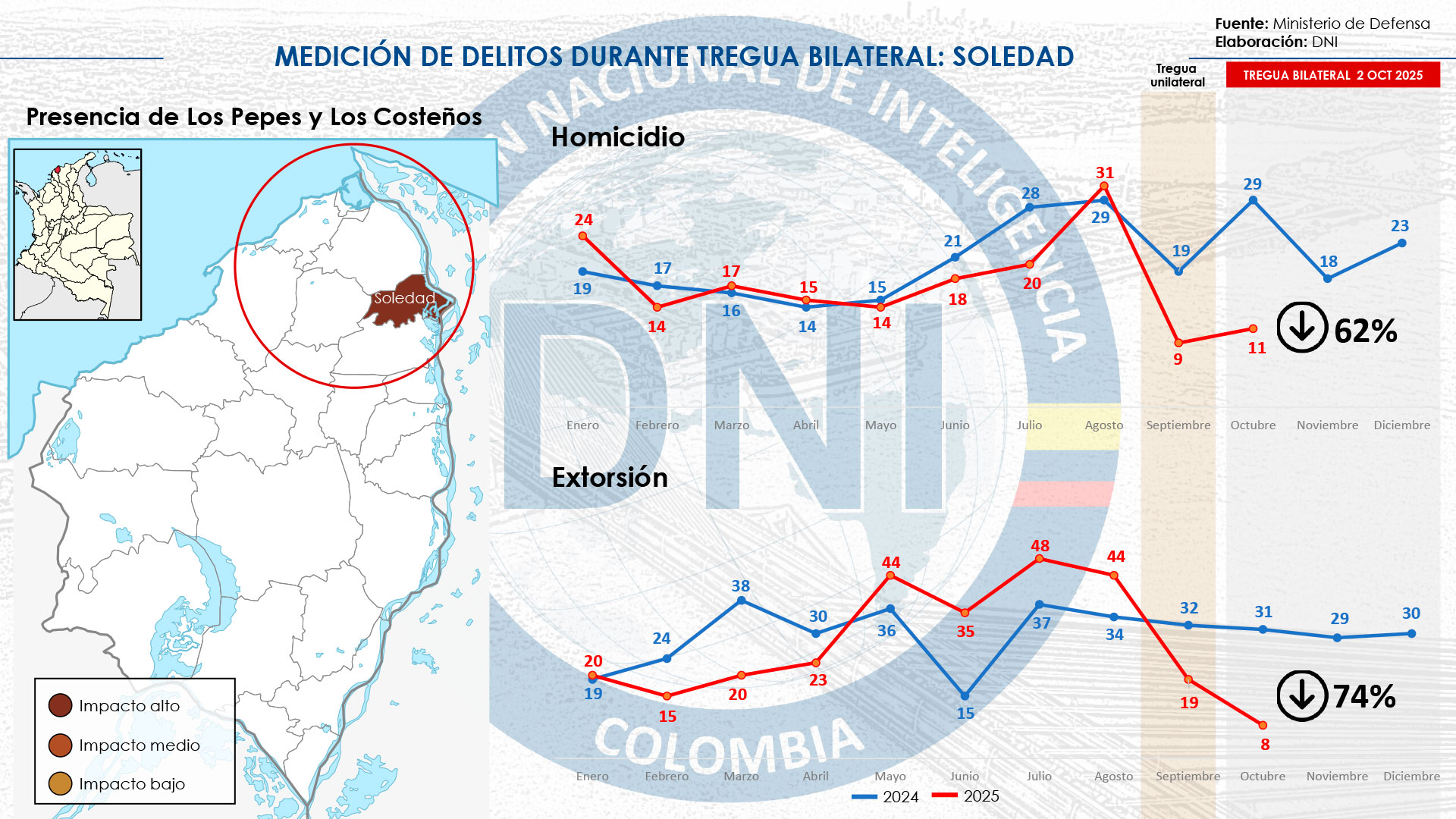 De acuerdo con el análisis elaborado por la Dirección Nacional de Inteligencia (DNI), durante el mes posterior a la tregua se registró una disminución notable en los delitos de homicidio, extorsión y hurto, especialmente en los municipios de Soledad, Malambo y Puerto Colombia, donde el impacto fue más alto.